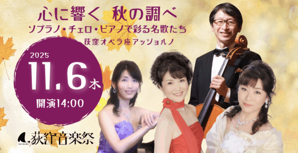 ソプラノ・ピアノ・チェロが彩る80席限定の荻窪駅近サロンで、初参加の自主企画ならではのワクワクする午後をお届けします。