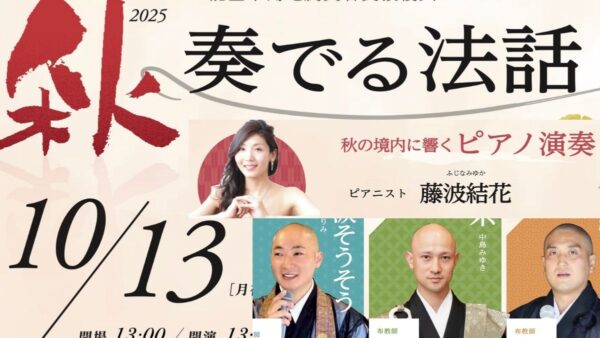 能登半島地震復興支援チャリティー『 奏でる法話 』を青梅・玉泉寺で初開催。ピアニスト藤波結花と三人の布教師が織りなす法話とピアノ演奏の融合。10/13(月祝)入場無料。