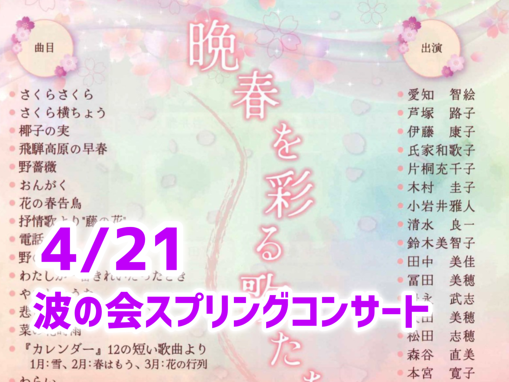 田中 直子 藤波 結花 - 曲目 さくらさくら さくら横ちょう 椰子の実 飛騨高原の早春 野薔薇 おんがく 花の春告鳥 抒情歌より“藤の花” 電話 野の羊 わたしが一番きれいだったとき やさしいうた 悲しみの意味~サフラン 菜の花時雨